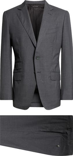 The label's impeccable tailoring is showcased on this timeless suit that pairs a two-button cutaway jacket with flat front trousers, both sewn from fine wool.