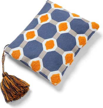Let the journey begin! This stylishly octagonal travel pouch keeps your belongings safe and secure, with a blue and white grid pattern and cute orange accents. Pull the tasseled zipper closed and head out on any adventure.