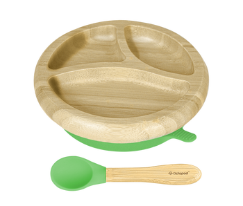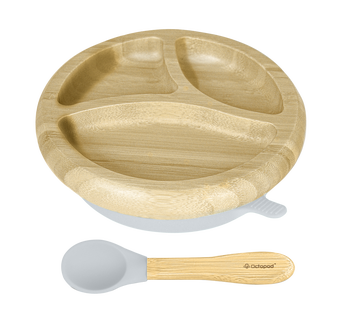 Make mealtimes fun and stress-free with the Abiie® suction plate with a spoon. Ergonomically designed, it comes with three compartments to separate your child’s favorite foods. While our suction plate is primarily made with the baby in mind, it is also thoughtfully designed to help reduce your carbon footprint. Made with sustainable wood, this safe and functional baby suction plate is a must-have for all loving parents.\nWhile our suction plate is primarily made with the baby in mind, it is also thoughtfully designed to help reduce your carbon footprint. Made with sustainable wood, this safe and functional baby suction plate is a must-have for all loving parents.\nStays in place. No more post-mealtime stresses! With its powerful suction feature, your baby’s dish remains secured at all times. Now, you don’t have to worry about spills and stains that occur whenever your little one eats. \nGuaranteed safe. At Abiie®, your child’s safety is of the utmost priority. That’s why our Octopod® suction plate is made of non-toxic products. It’s also free from harmful compounds such as phthalates, BPA, lead, and PVC.\nFits any high chair. Ergonomically designed and conveniently sized, our baby suction plate fits our modern high chair (and any other high chair, for that matter) like a glove. \nConforms with safety standards. Our baby plate set meets safety regulations, so you know you’re getting a safe and reliable product for your precious one. \nQuality assured. We stand by our Octopod® Dish. So if the suction cup fails or the product fails to meet your expectations, you can return it to us. Just reach out, and we’ll get started on your refund right away.