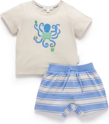 The sweetest little summer set! Our Octopus Short and Tee Set takes the fuss out of dressing with the perfect matching outfit. Featuring a jersey tee with an octopus applique, and comfy shorts in a classic stripe. Made from the softest 100% Cotton for a soft and breathable summer outfit.