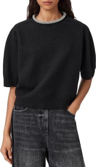 Slightly oversized and framed by puffy elbow-length sleeves, this all-wool sweater goes for a glam finish with a rhinestone-ringed collar.