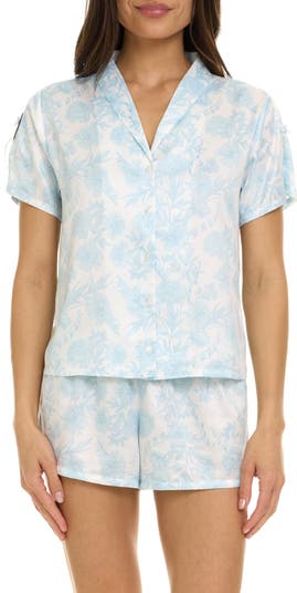 Slumber soundly or simply lounge in the slinky comfort of these satin pajamas featuring a short-sleeved button-up and a pair of matching shorts.