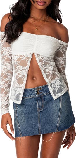EDIKTED Odessa Split Front Off the Shoulder Lace Top