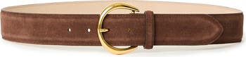 A gilded round buckle offers a cool, polished counterpoint to the plush suede of this belt crafted for a casual addition to your look.