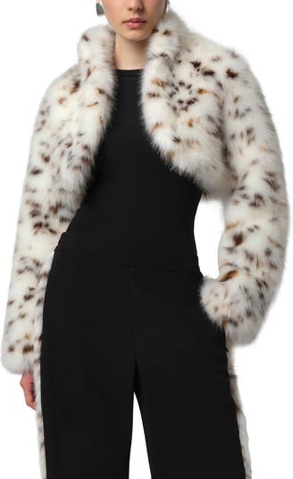 Snow-white faux fur with sprinkles of leopard spots makes the perfect bolero in this fluffy long-haired version that works well for evening and daytime affairs alike.