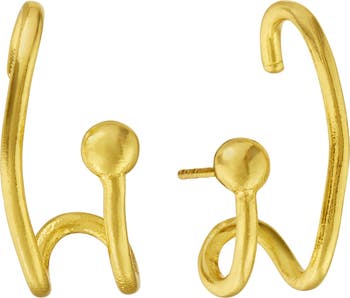 Designed to loop over the ear, these unique pair is a cross between a pair of stud earringngs and an ear-cuff. Handmade with 21ct gold-plated recycled brass, these earringngs are the perfect addition to your ear-stack.