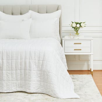 - Crafted from 55% Linen 45% Cotton, this lightweight quilt offers breathable comfort for all seasons. The 90" x 92" Odine quilt features a modern geometric hand-stitched pattern, adding subtle texture and elegance to any bedroom. The soft dove color blends seamlessly with contemporary, minimalist, and farmhouse décor styles. Perfect for layering in spring and summer or as a standalone bedding piece for a cozy yet sophisticated touch.