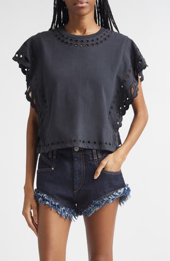 Broderie anglaise trims a faded-wash T-shirt to elevate it from wardrobe staple to instant statement.