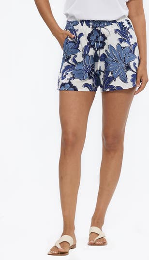 Keep it cute in linen-kissed shorts tossed with blue blooms and closed with a comfy drawstring.