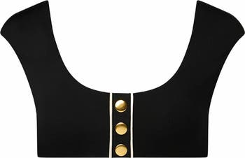 A pullover silhouette featuring a scoop neck and cap sleeves, this fully lined bikini top offers moderate coverage. A faux placket details the front, along with a row of decorative snaps. 85% Nylon 15% Spandex Hand wash in cool water. Do not bleach. Do not tumble dry. Hang to dry. Do not iron.