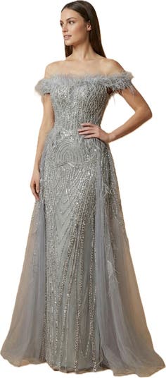 Off Shoulder Gown with Feathers