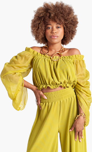 An off-the-shoulder pleated crepe top styled with voluminous organza puff sleeves for a bold yet polished look. Style with matching pants.
