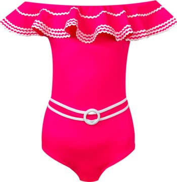 Off Shoulder Ruffle Ric-Rac Trim One Piece Swimsuit, Little Kid-Big Kid