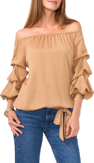 Soft crepe adds a luxurious feel to this shoulder-baring top framed by beautifully ruched bubble sleeves and a tie at the hem.