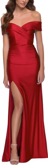 Stretch shiny jersey gown with off the shoulder top and slit. Ruching throughout to give a flattering fit for any body type. Back zipper closure.