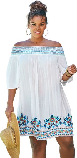 Beautiful off-the-shoulder design keeps you stylish and cool from pool to beach. Elegant embroidery at the chest and hem adds a touch of sophistication. Elbow-length sleeves provide comfortable coverage and a relaxed fit. 38" length for the perfect amount of coverage. Soft, lightweight rayon fabric ensures all-day comfort. Easy-care with hand wash instructions for lasting quality. Imported