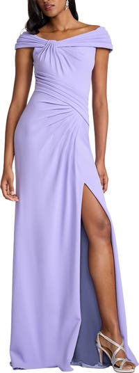 A sophisticated choice for evening occasions, this textured stretch-crepe gown is designed with an off-the-shoulder neckline and cap sleeves for an elegant, sculpted look. Soft draping across the bodice flatters the figure, while the sleek column skirt and front slit add graceful movement and a hint of allure.