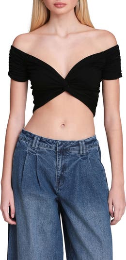 Let your shoulders and midriff own the moment in this stretchy crop top with a front twist.
