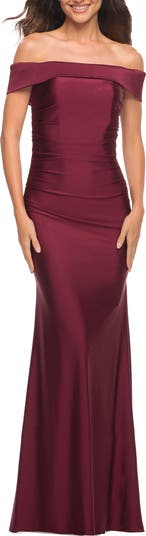 Elegant off the shoulder evening gown with ruching throughout body. Back zipper closure.