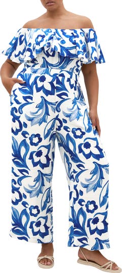 A brushstroke floral pattern makes a bold, artistic statement on this wide-leg jumpsuit topped with an off-the-shoulder neckline.