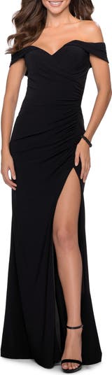 Off the shoulder floor length jersey prom dress with beautifully draped sleeves. Features side ruching and leg slit. Back zipper closure.