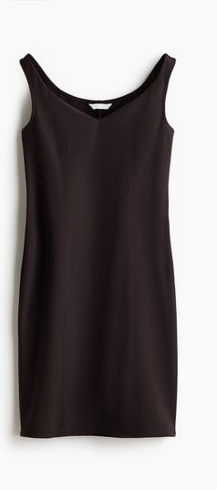 Short, fitted dress in heavy jersey with a V-neckline at the front, scoop back and wide shoulder straps that sit slightly off the shoulder and are held in place with a concealed silicone trim. Concealed zip at one side.