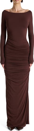 Give your curves a hug in this ruched maxi dress featuring a shoulder-baring neckline and a floor-grazing skirt.