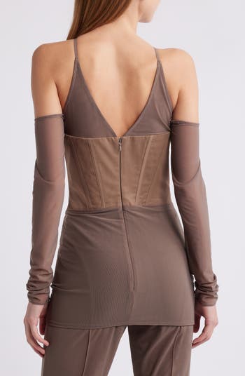A corseted bodice shapes this sleek shoulder-baring dress cut in a leggy length.