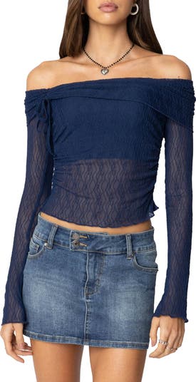 A foldover neckline accentuates the shoulder-baring silhouette of a sheer and subtly textured crop top that's a retro style standout.