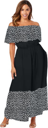 Soak up sunny days in this must-have maxi dress. The full elastic neckline allows you to wear this dress both on and off the shoulder. Elastic waist, ruffle overlay. Side seam pockets.