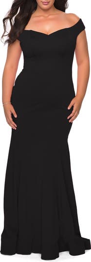 Figure flattering plus size jersey prom gown with off the shoulder bodice. Back zipper closure.