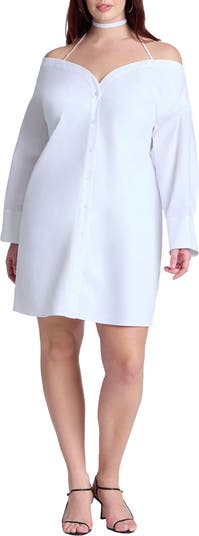 An off-shoulder halter poplin mini with cuffed long sleeves and a cinched back waist.