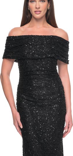 Off the shoulder fitted beaded lace dress with ruching. Back zipper closure.