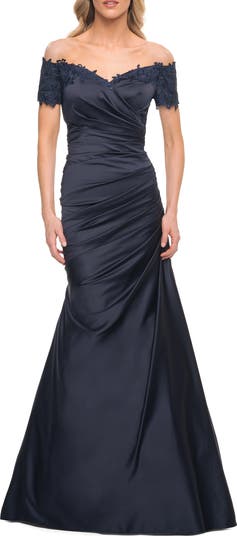Off the shoulder satin mermaid gown with short sleeves and full lace back. Pleating across front and back of gown. Back zipper closure.