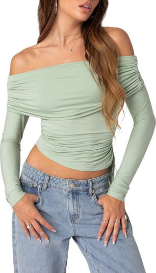 EDIKTED Off the Shoulder Side Ruched Knit Top, Alternate, color, Green