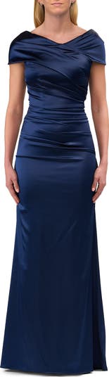 Off the shoulder satin ruched gown with a criss cross top. Back zipper closure.