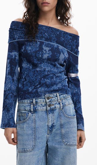 This fun sweater lets you show off a little skin with a ribbed foldover neckline and gives you a retro edge with its cool arty print and flared long sleeves.