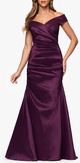 An off-the-shoulder neckline adds to the allure of this elegant taffeta gown ruched through the waist and finished with a slightly flared hem.