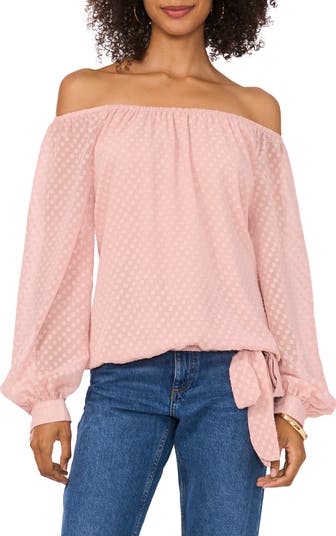 Blousy long sleeves artfully frame this off-the-shoulder blouse made form a clip-square chiffon and finished with a jaunty tie at the hem.