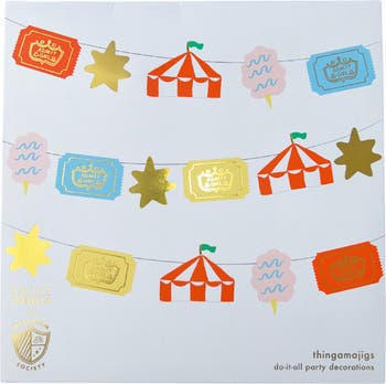 Carousels and cotton candy...oh my! Featuring carnival-inspired colors and pops of gold foil, these thingamajigs bring all the fair fun! We think they're perfect for fair, carnival, and circus parties! What exactly are thingamajigs, you ask?! They are our favorite do-it-all party decorations! String them together to make a garland, attach them to balloons, hang them on the wall...you decide!