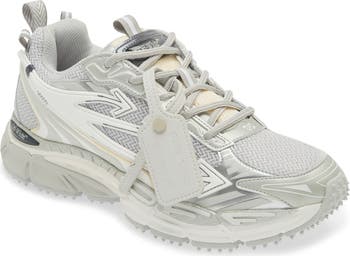 Spiky pebbles stud the sole of a heavily layered sneaker that serves signature Off-White style with swooping arrows and a matching zip tag in a sleek silver palette.