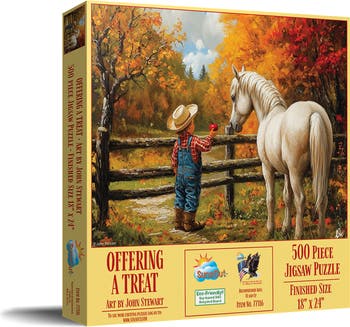 Experience the charm of Americana with the "Offering a Treat" 500-piece jigsaw puzzle from SunsOut Puzzles, beautifully illustrated by JQ Licensing. This heartwarming puzzle transports you to a serene farm setting, where a child and a horse share a tender moment, offering a perfect escape for adults seeking tranquility. Each piece is expertly crafted from high-quality recycled cardboard, ensuring a smooth assembly with its precise interlocking design that minimizes frustration, allowing you to fully immerse in the vibrant imagery. Proudly made in the USA, the eco-friendly materials and soy-based inks reflect SunsOut’s commitment to sustainability, making your purchase a responsible choice for the planet. With a finished size of 18" x 24", the puzzle showcases a rich, colorful display that brings the artwork to life, while the high standards of quality and authenticity are guaranteed through its licensed design. SunsOut backs its products with a warranty against missing or damaged pieces, providing peace of mind with every puzzle experience. As a woman-owned small business, SunsOut is dedicated to delivering captivating puzzles, making this piece not only a beautiful pastime but also an unforgettable gift that celebrates the bond between nature and humanity—perfect for puzzle enthusiasts and art lovers alike.