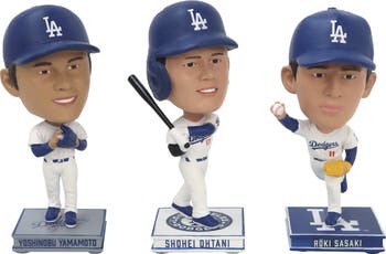The MLB Los Angeles Dodgers Shohei Ohtani Roki Sasaki Yoshinobu Yamamoto Mini-Bobblehead 3-Pack features 3 of the best Japanese players all in Dodger Jersey's. Each mini-bobblehead features amazing likeness to all 3 superstars and stand about 4 1/2-inches tall. Yamamoto and Saski are in their pitching poses while Ohtani is in a batting pose.