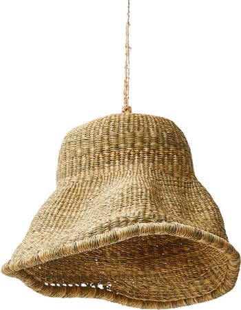 - PRODUCT FEATURES: - Handwoven in Ghana from locally sourced elephant swamp grass - Unique, organic shape adds artisanal charm and visual interest - Creates a warm, diffused light for a cozy atmosphere - Supports women artisans and community education programs PRODUCT SPECIFICATIONS: - Dimensions: 15" W x 8.5" H - Material: Elephant swamp grass - Color: Natural CARE INSTRUCTIONS: - Care: Spot clean - Note: Due to the handmade quality, some size and color variation may occur.