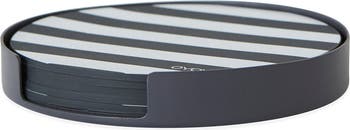 The Oka Coaster comes with six pieces of Anthracite coloured silicone mats, which bring a stylish element to the otherwise classic and simple coaster, making the Oka Coaster both practical and beautiful. The coaster is made of brass plated metal, and the mat is made of printed silicone. For cleaning it is recommended to wipe with a wet cloth.