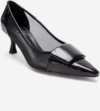 A sleek stiletto that elevates refined silhouettes with patent-front detailing and airy mesh panels for a contemporary finish