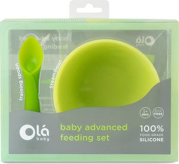 Encourage baby to eat on their own with this food-grade silicone set that includes a training spoon and a SteamBowl. The training spoon has a flexible material to scoop food at any angle and protect gums and newly erupted teeth. The bowl steams and serves baby's food all in one—the bottom extends for steaming and collapses for feeding.