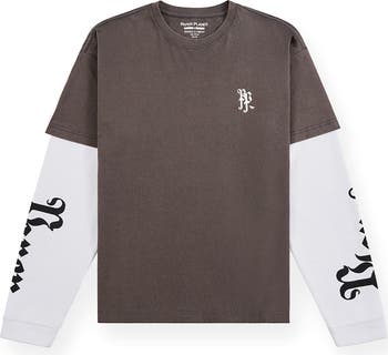 Graphics stamp the layered-look sleeves of this T-shirt cut from soft, breathable cotton that feels cool and comfortable all day.
