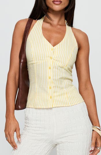 Summery stripes mark this seersucker halter top cut in a close fit with buttons running down the front.