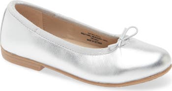 A contoured footbed provides comfort for your kiddo in a flat topped with metallic leather for added shine.
